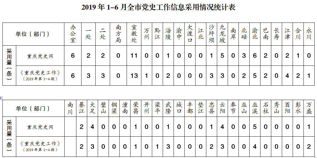 2019年1-6月全市党史工作信息采用情况