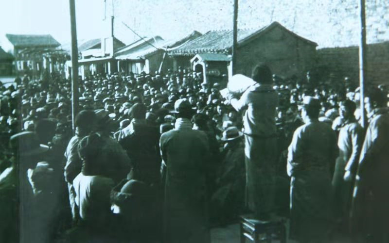 1935年一二·九运动,被阻在西直门外的清华、燕京等大中学校的学生举行群众大会。陆璀(当时是清华大学学生救国委员会委员、四年级学生)正在手持话筒向群众宣传抗日救国。