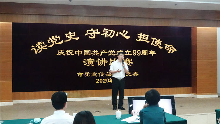 2020年7月1日下午,市委宣传部举办“读党史、守初心、担使命”庆七一主题演讲比赛。来自部机关各党支部推荐的10名优秀选手饱含深情地讲述党史故事,重温党的光辉历程,讴歌党的丰功伟绩,庆祝中国共产党成立99周年。