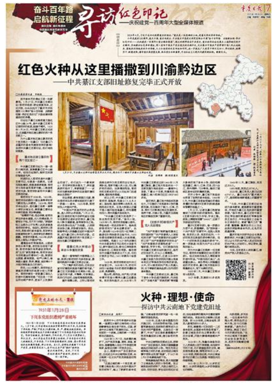 今年是建党100周年。市委党史研究室联合重庆日报、重庆电视台推出“奋斗百年路 启航新征程·寻访红色印记——庆祝建党一百周年大型全媒体报道”,于1月27日正式拉开序幕,重点回顾在中共党史、重庆经济社会发展史上值得铭记的历史瞬间,深入宣传中国共产党在重庆的光辉历史,充分展示中国共产党带领中国人民从站起来、富起来到强起来的丰功伟绩,大力弘扬党的光荣传统和优良作风,进一步激发广大党员干部不忘初心、牢记使命,凝心聚力、锐意进取,谱写重庆高质量发展、高品质生活新篇章,开启社会主义现代化建设新征程。