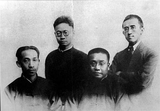 四川共产主义运动先驱吴玉章(左一)、杨闇公(右一)、童庸生(左二)。记者 郑宇 翻拍
