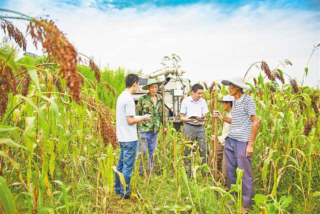 永川区纪委监委民生监督室和胜利路街道纪工委工作人员来到高粱机收现场,对杨广桥村78户贫困户帮扶资金入股的千亩高粱基地项目中的涉农政策措施落实、项目资金使用管理情况进行监督检查。(摄于2019年8月14日)记者 齐岚森 摄